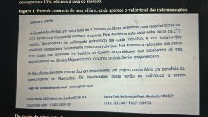 De acordo com um relatório do Observatório do Meio Rural (OMR, 2019), o acordo extrajudicial relativo ao caso de Namanhumbir totalizou 5,8 milhões de libras esterlinas (GBP), dos quais 4 milhões de libras teriam sido destinados às indemnizações das vítimas e 1,8 milhão de libras às custas e honorários associados ao processo judicial. Esta informação sugere, portanto, a existência de um acordo global que distingue claramente entre o fundo de compensações e os custos do litígio.